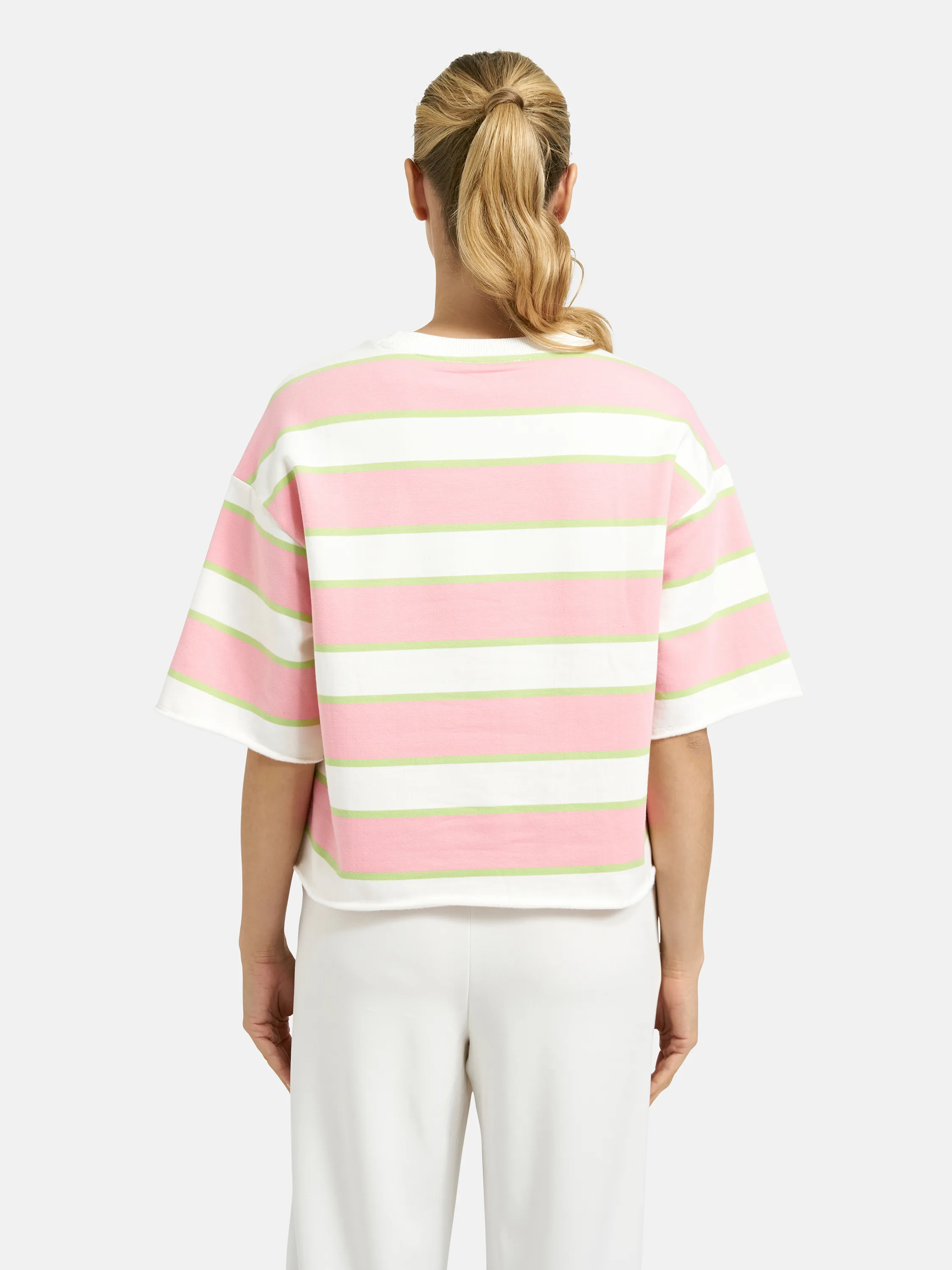 Dieses kurzärmlige Sweatshirt überzeugt mit einem modernen Streifenmuster und seinem sportiven Stitching auf der Brust. Die weiche Sweatqualität sorgt für ein angenehmes Tragegefühl, während der lockere Schnitt Bewegungsfreiheit bietet. Kombinieren Sie es mit Jeans oder Shorts für einen entspannten Freizeitlook oder mit Stoffhosen für einen sportlich-eleganten Style. Ein Shirt, das Komfort und Style mühelos vereint!
